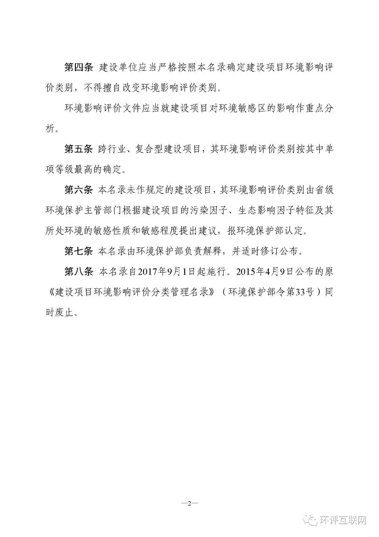 第八條 本名錄自2017年9月1日起施行。2015年4月9日公布的原《建設(shè)項(xiàng)目環(huán)境影響評(píng)價(jià)分類管理名錄》(環(huán)境保護(hù)部令第33號(hào))同時(shí)廢止。
